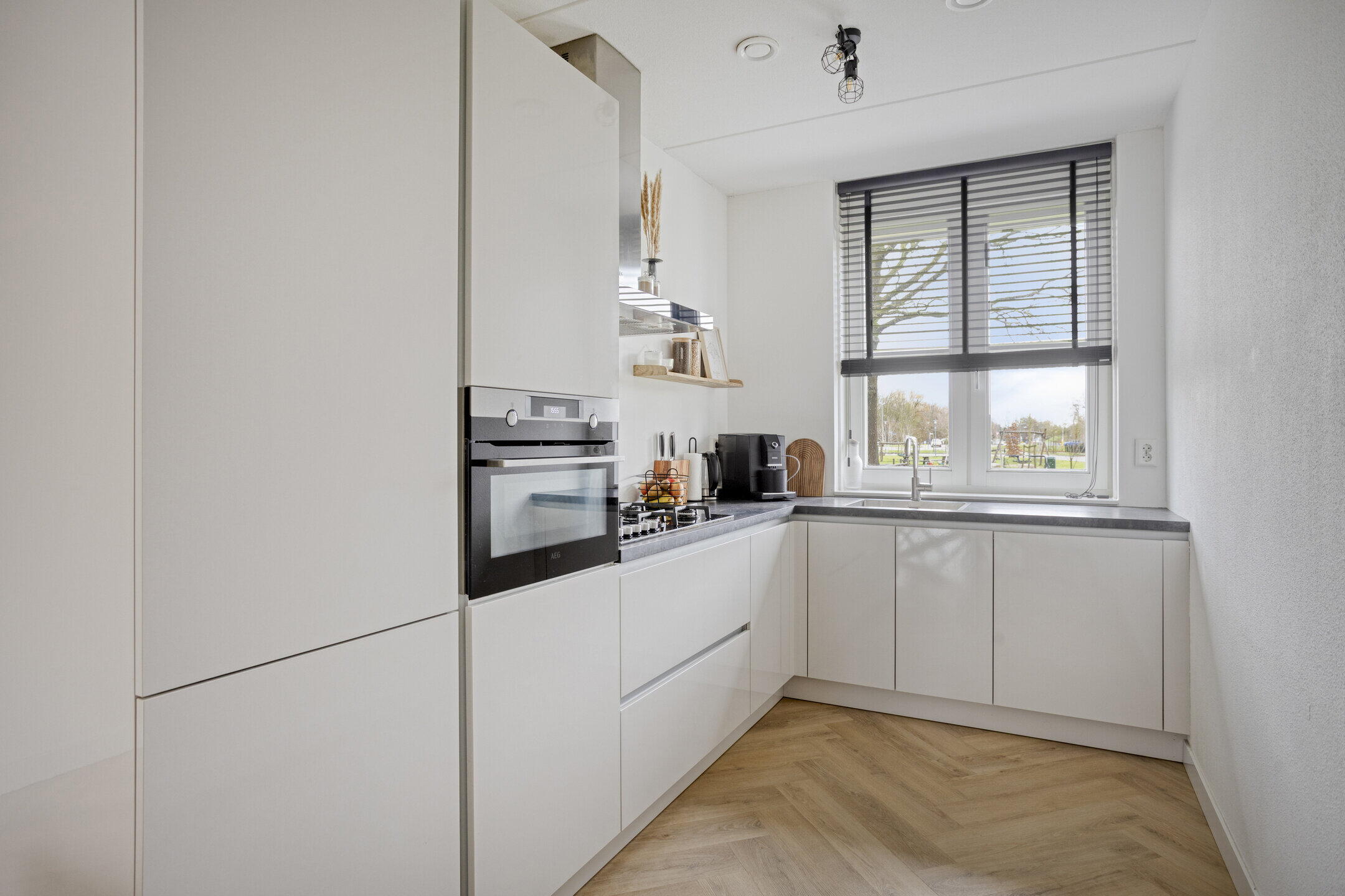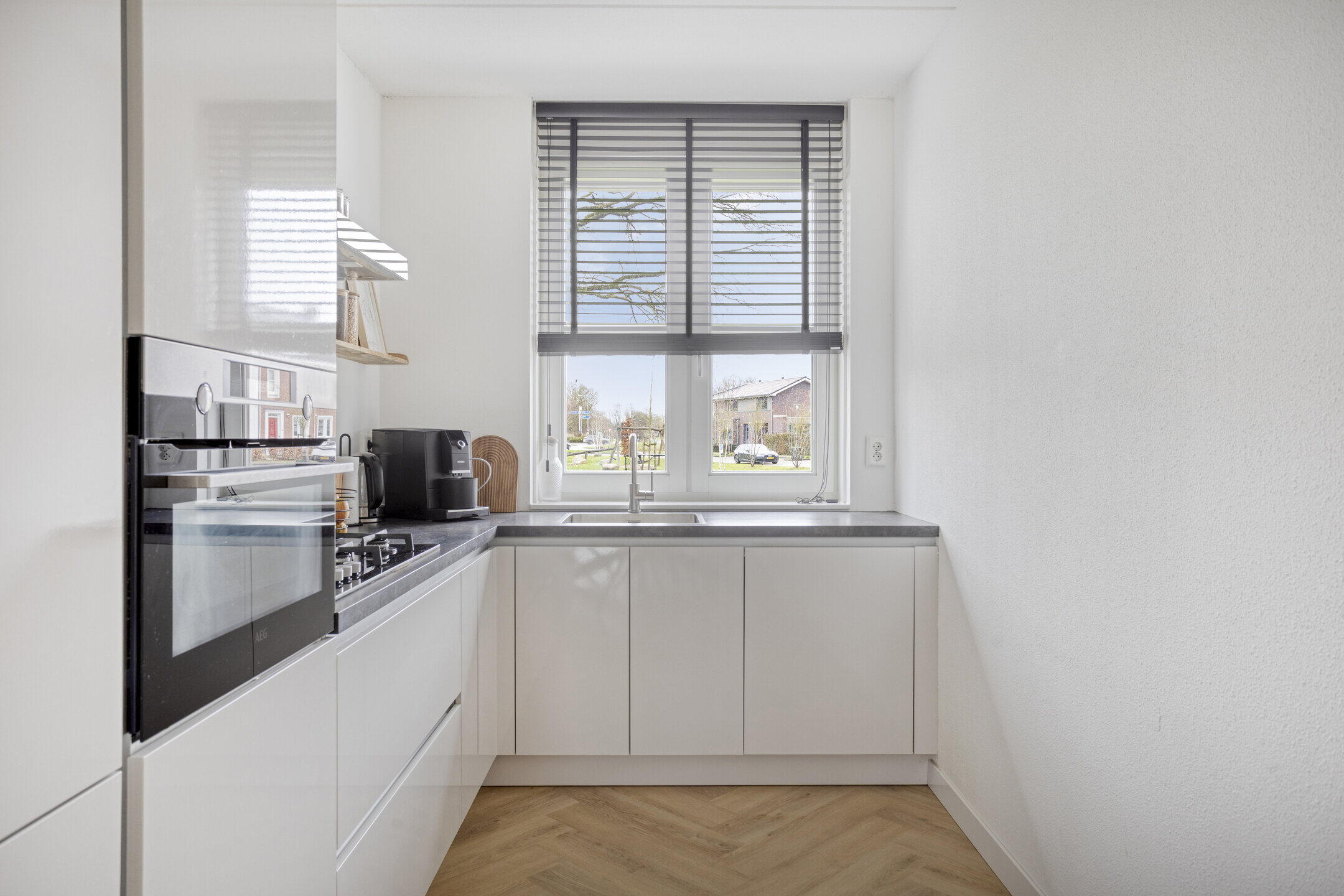 Aan de voorzijde ligt de open keuken, strak en modern uitgevoerd met complete inbouwapparatuur, waaronder een koelkast, vriezer, gaskookplaat, vaatwasser, combi oven en afzuigschouw.